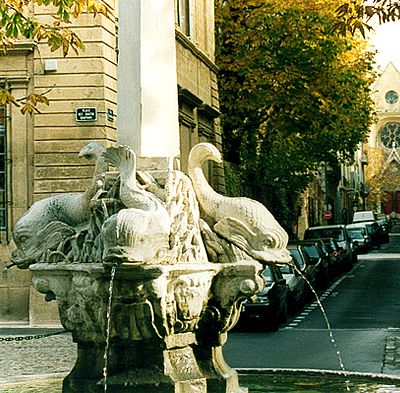 The site of the counts’ palace and the commerce that their presence generated, gave rise to what is known as the "ville des comtes". It includes most of the area between the belfrey tower adjoining the city hall and the Cours Mirabeau to the south. The reign of the counts was not all peaceful or even happy. The black plague, the hundred years’ war, and the intrusion of armed bands of "rouitiers", crusaders on the loose, precluded peace and plenty. One figure among this bellicose company stands out, his fame surpassing that of Aix’s most distinguished citizens. His statue stands at the east end of the Cours Mirabeau, like a high priest gazing beyond his flock toward the baptismal font spouting to the west.