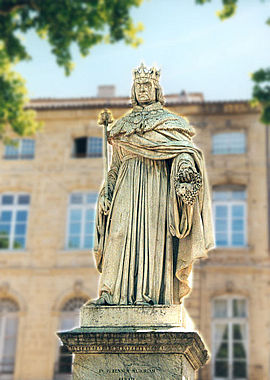 René d’Anjou (1434 - 1480), king of Jerusalem, king of Naples and Sicily, duke of Lorraine, the summum bonus in local lore, the penultimate "count" to reign in Provence is credited with great virtue and noble character. His reputation as poet, artist, musician, patron of the arts,of agriculture and the courts of love, importer of the muscat grape into Provence, does him more than justice. The sour judgement of a recent historian refers to him as "in reality, a deplorable, wily individual onto whom the Provençal populace projected a generous hearted bonhomie".