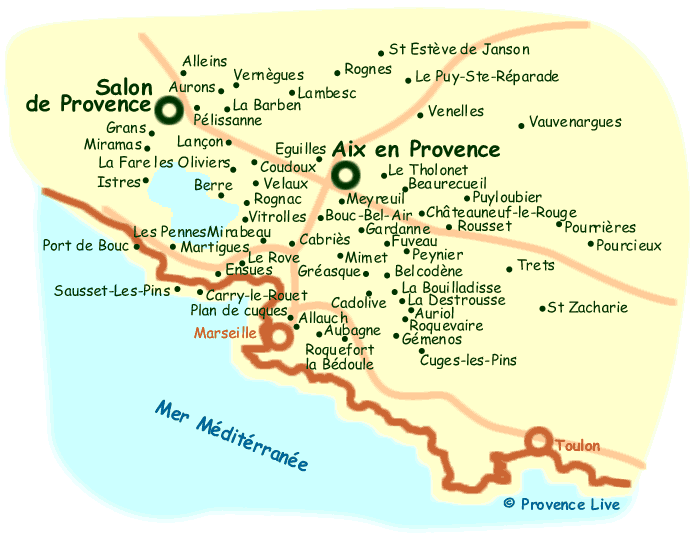 olive oil (A.O.C.) : The olives produced for Aix-en-Provence (Appellation d'Origine Contrôlée) olive oil are harvested and processed within the geographical area illustrated on the map bellow. |