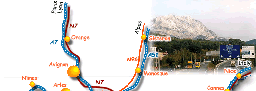 Modern traffic whisks briskly by on its way from Nice, Marseille, Paris, and the Alps, hugging the ancient Roman ways favoured by the early carriageways. The famous N. 7, <nationale sept > which once lumbered through every village and small town on the way to Nice from Paris has been “doubled” by modern highways <autoroutes> which crisscross its path.